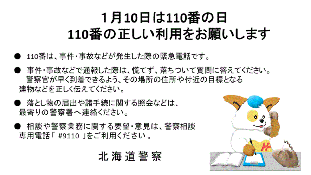 - 緊急の対応を必要としない遺失物・拾得物の届出、諸手続に関する照会などは、最寄りの警察署へ連絡、相談や警察業務に関する要望・意見は警察相談専用電話「#9110」をご利用ください。
