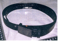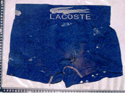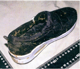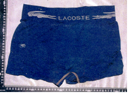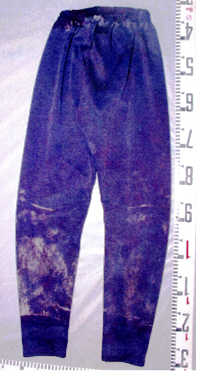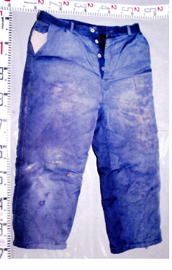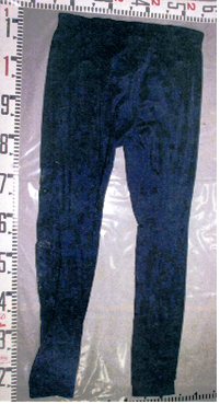 | 着衣 | 薄緑色防寒ズボン(ボタンにRIKLAINと表記、サイズ不明)、紺色ズボン(サイズ不明)、紺色スウェットズボン(サイズ不明)、紺色トランクス(LACOSTE製)、黒色ベルト(バックル裏面に中国語の簡体字の表示)、靴(黒色、サイズSS、左足) | |||||