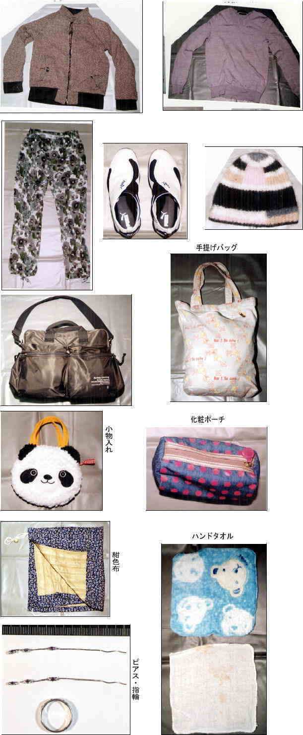 | 所持品など | 緑色系ナイロン製バッグ・ナイロン製カーキ色二つ折り財布ほか | |||||
