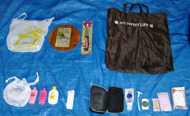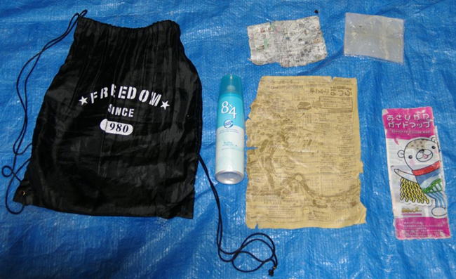 | 所持品など | 黒色ナップサック、茶色ナイロンバック、洗面道具、まな板、包丁、下着、留萌・増毛・旭川ガイドマップ など | |||||