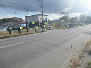 農産加工会社ウエニシ前の国道にて交通事故防止の啓発活動を実施しました