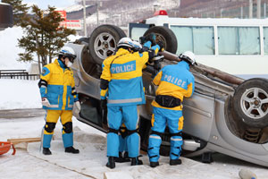 当日は警察署前に横転状態の車両を配置して、車内に取り残された要救助者(人形)を迅速、安全に救出する方法を何度も確認したほか、協議会委員の方々にも、装備資機材を使ったガラスの破壊などを体験して頂きました。