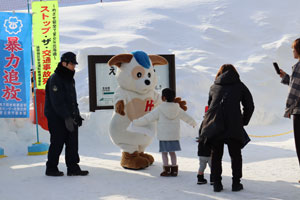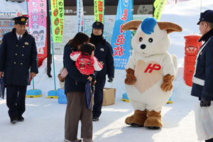1月10日、110番の日に合わせ、道の駅えんがる森のオホーツクにおいて街頭啓発を行いました。当日は天候にも恵まれ、多数の来場者に啓発品をお渡ししながら交通安全や犯罪被害の防止などについて呼びかけることができました。