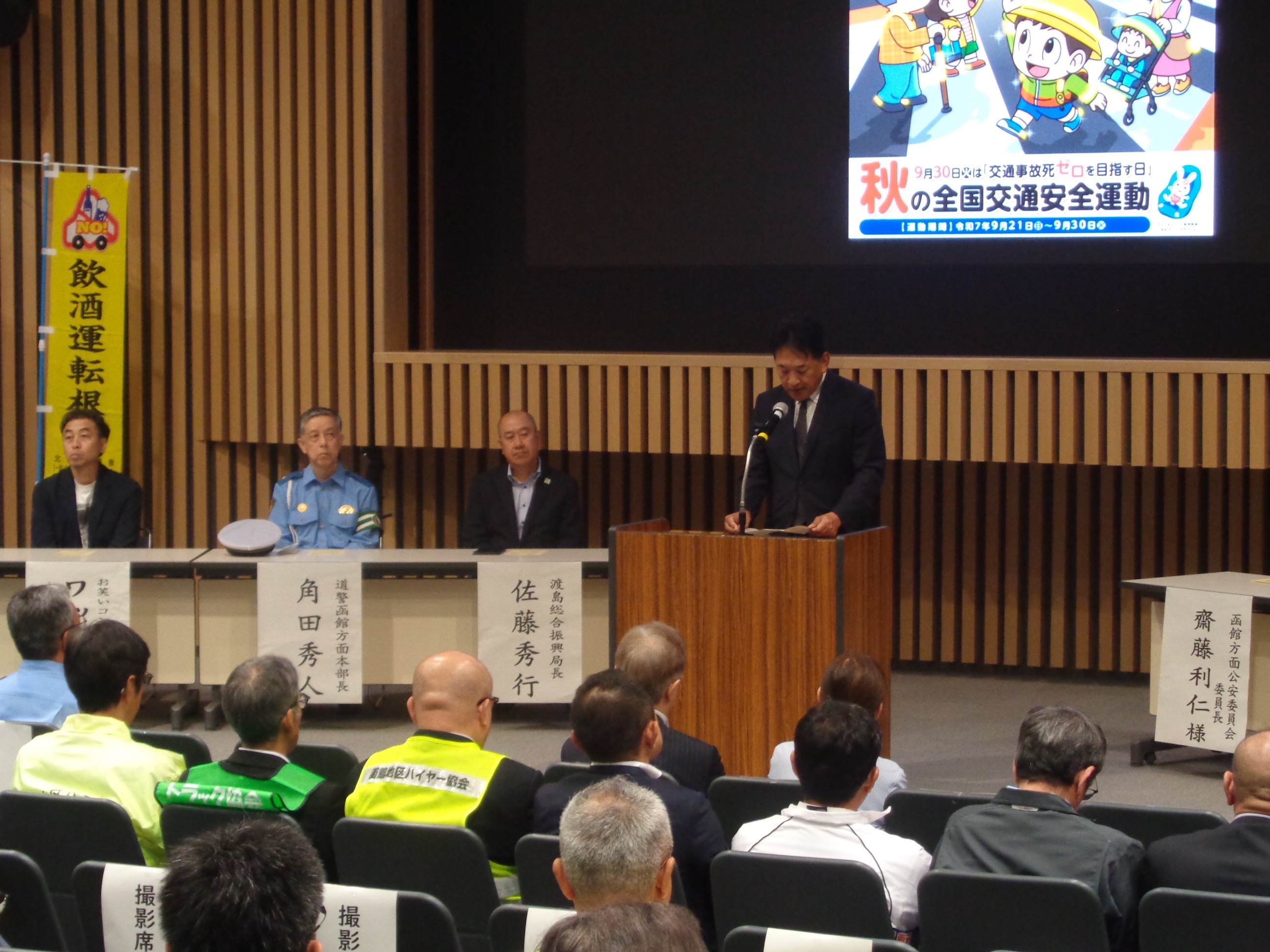 9月25日、全委員が、令和7年秋の全国交通安全運動総決起集会に出席し、齋藤委員長が来賓挨拶を述べました。