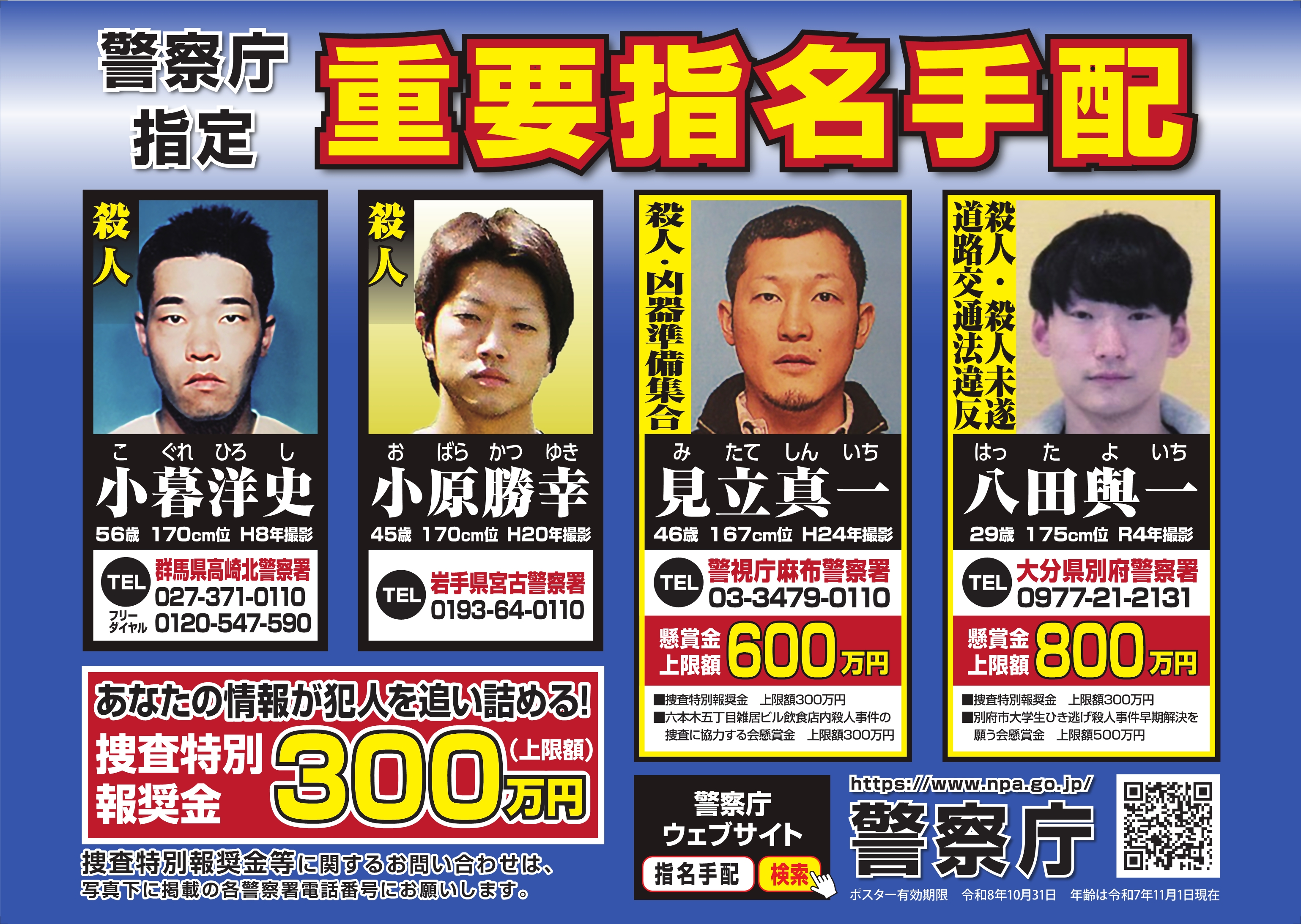 指名手配被疑者に関する情報は、どんな些細なことであっても、ためらわずに110番通報又は最寄りの警察施設に連絡をいただきますよう、よろしくお願いいたします。