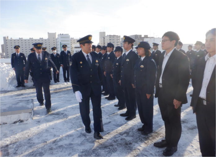 令和8年の年頭にあたり、署員の厳正な規律を養うとともに、治安維持に対する決意を新たにするため、さらには貸与品の適正な管理状況を確認するため、当署屋上において年頭点検を実施しました。