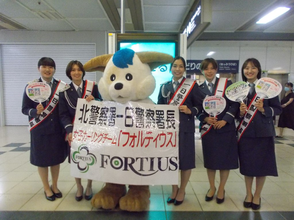 夏の交通安全運動(7月13日~7月22日)を迎えるにあたり、交通事故防止を広く道民に呼びかけるため、女子カーリングチームの「FORTIUS」の選手5名に1日警察署長を委嘱しJR札幌駅にて街頭啓発を実施しました。