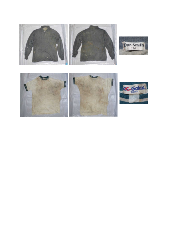 | 着衣 | 長袖ポロシャツ(灰色無地、左胸部にポケット付、メーカーDur-Smith、Mサイズ)半袖シャツ(白色無地、襟部及び袖部に緑色のライン入り、メーカー Galax(ギャレックス)) | ||