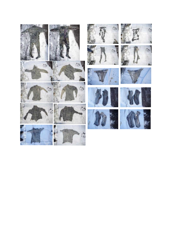 | 着衣 | ドライスーツ(株式会社ゼロ)、インナー様のもの、股引様のもの、セーター、ニットウェア(Huasen、XLサイズ)、長袖シャツ(チェック柄)Tシャツ(MOTOR)、下着様のもの(Biue Pine、洗濯表示にハングル文字)、厚手靴下、靴下 | ||