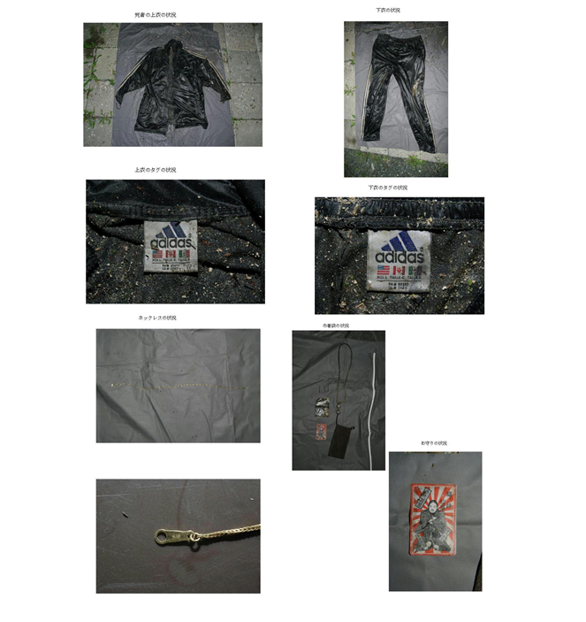 | 所持品等 | 金色ネックレス、巾着袋(お守り等在中) | ||