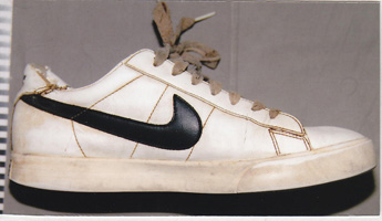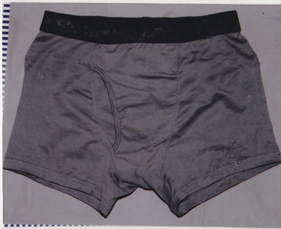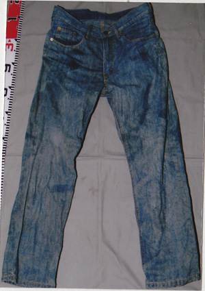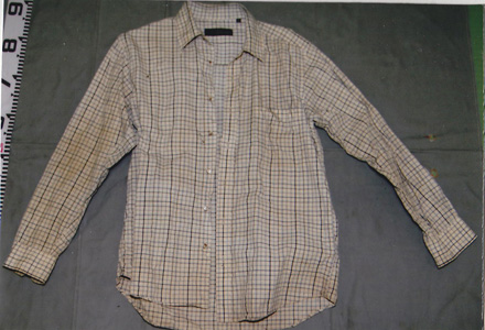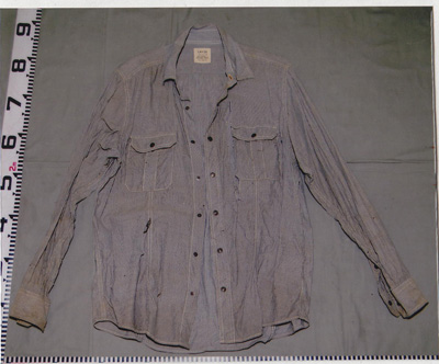 着衣 青色ジーパン、灰色縦じまシャツ、白色チェック柄シャツ、白色半袖Tシャツ、灰色ボクサーパンツ、黒色靴下、白色運動靴