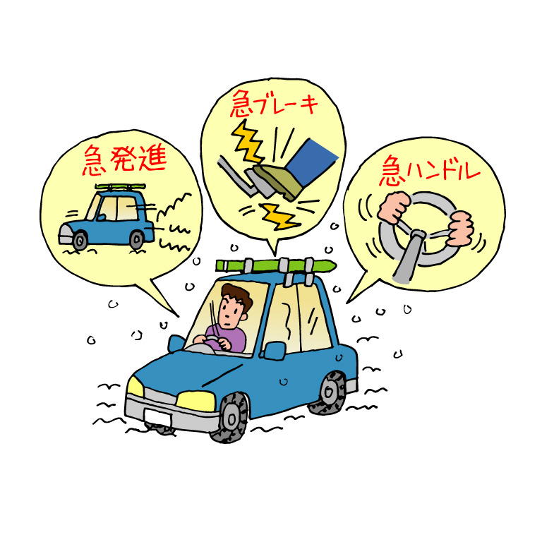 急発進、急ハンドル、急ブレーキといった「急」のつく運転操作は、冬道における危険行為となります。
