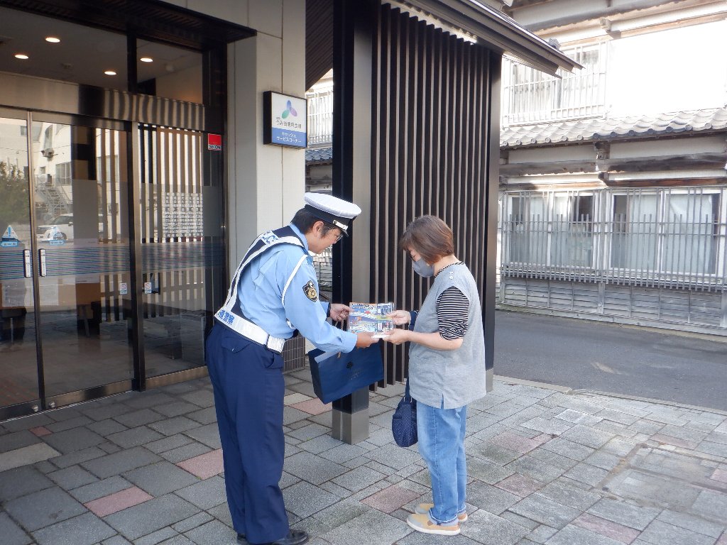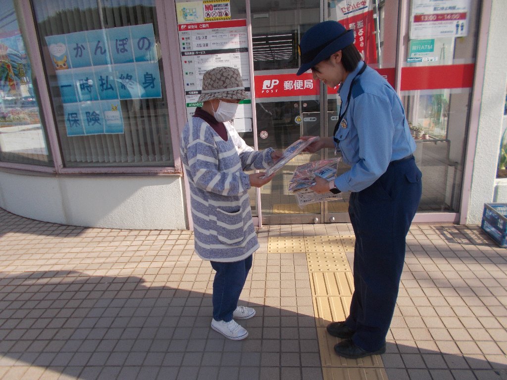 年金支給日にあわせ、管内の金融機関において、利用者に対し、特殊詐欺被害防止に向けた啓発活動を実施しました。
