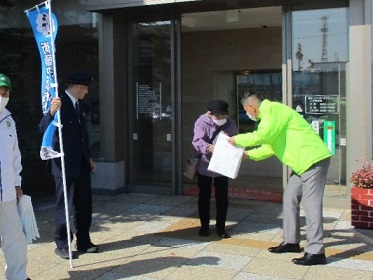 年金支給日に合わせ、根室市内の金融機関3店舗前において、特殊詐欺防止や交通安全、暴力団追放など、防犯に関する啓発グッズを配布しました。