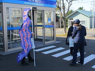 年金支給日に合わせ、根室市内の金融機関3店舗前において特殊詐欺やクレジットカード不正利用防止など呼び掛けました。