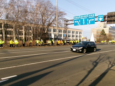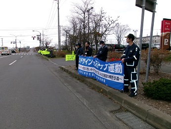 その後、根室振興局前交差点において「旗の波運動」を実施し、交通安全を呼び掛けました。