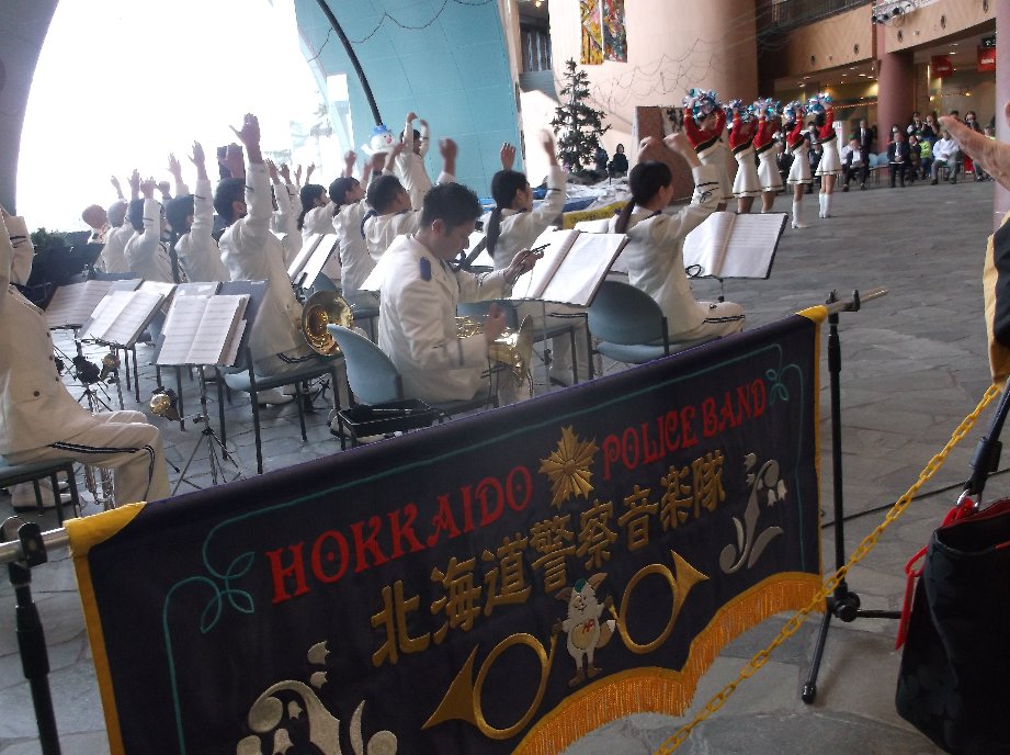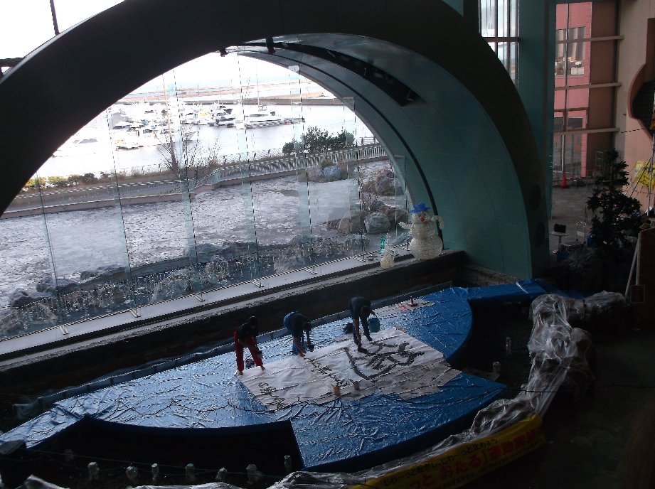 小樽桜陽高等学校の生徒が書道パフォーマンスを行い、冬道における交通安全標語を制作して