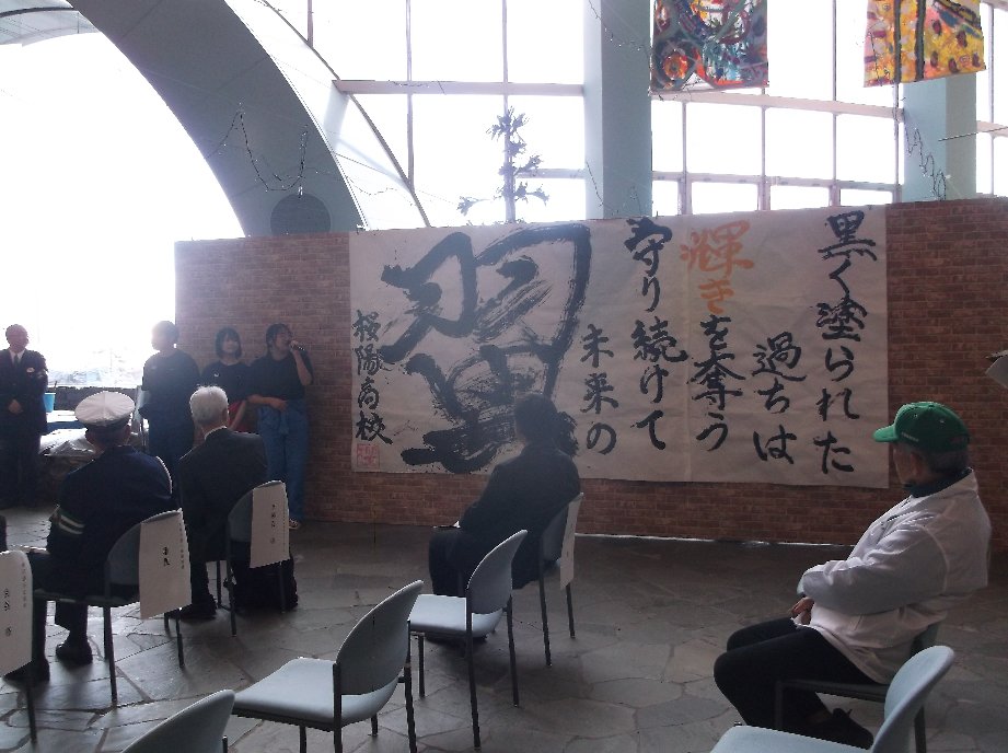 小樽桜陽高等学校の生徒が書道パフォーマンスを行い、交通安全標語を製作しました。