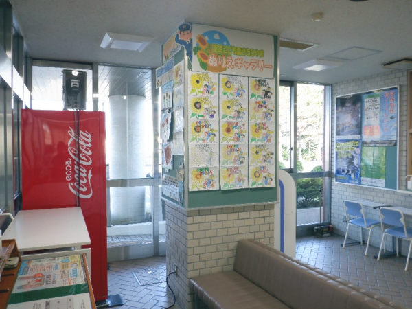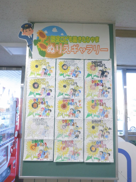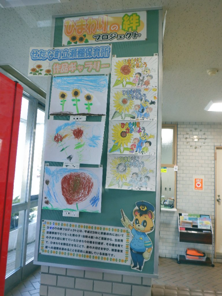 ひまわりの絆プロジェクトで植えたひまわりを題材に、こどもたちが作成したぬり絵と絵をせたな警察署の待合室に展示しました。