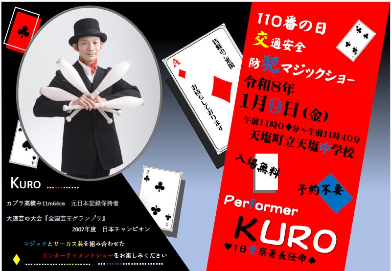 1月10日は、「110番の日」です。これに先立ち、パフォーマーのKUROさんの協力を得て、1月9日、天塩町立天塩中学校において、「110番の日 交通安全 防犯マジックショー」を実施します。どなたでも御覧になれます。ぜひお越しください。