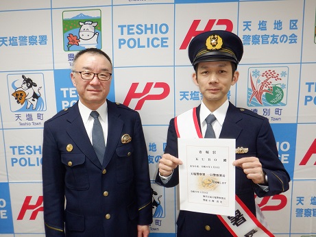 長年にわたり、安全かつ円滑な道路交通の維持に貢献していただいている鹿児島建設株式会社様と、平成25年から毎年1月10日に問寒別駐在所で制作しているミニパトカーの雪像制作に協力し、110番の適正利用の促進に貢献していただいている土屋建設株式会社様に、5月15日、天塩警察署長から感謝状を贈呈しました。