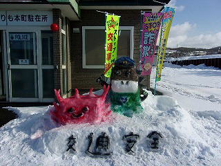 えりも本町駐在所員と駐在所家族が協力し、駐在所前に雪像が完成しました!