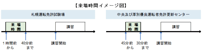 来場時間は、予約した講習の時間ではなく、下記のとおりです。