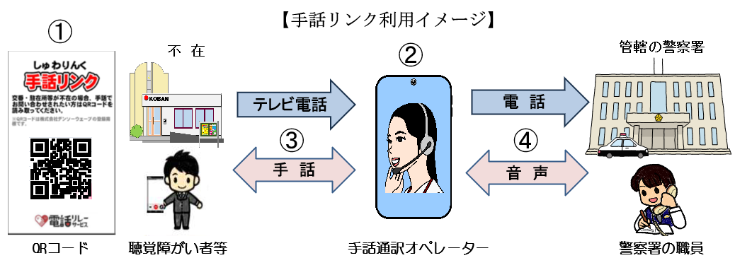 交番(こうばん)などが不在時(ふざいじ)、「手話(しゅわ)リンク」で警察署(けいさつしょ)に連絡(れんらく)できます。