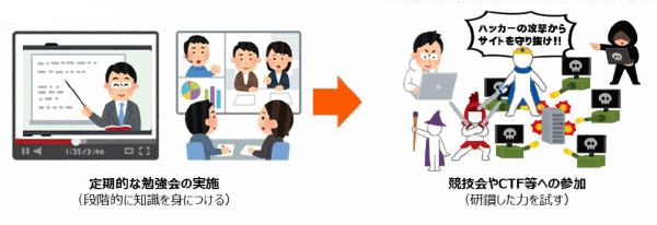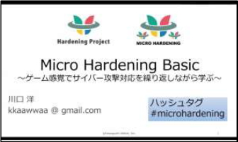 ■ サイバーセキュリティ勉強会 ■ Micro Hardening(マイクロハードニング) Micro Hardening は、サイバー攻撃に対応するセキュリティ対策をゲーム感覚で学ぶハンズオントレーニングで、サイバー攻撃の手法や脆弱性の影響などを現場における経験として学ぶことができます。 SC4Y では、株式会社川口設計からの技術提供を受け、勉強会で身につけた技術、知識等の力試しの場として、Micro Hardening を開催しています。 ※Micro Hardening の詳細はこちらをご覧ください。(別ウィンドウで開きます。) |